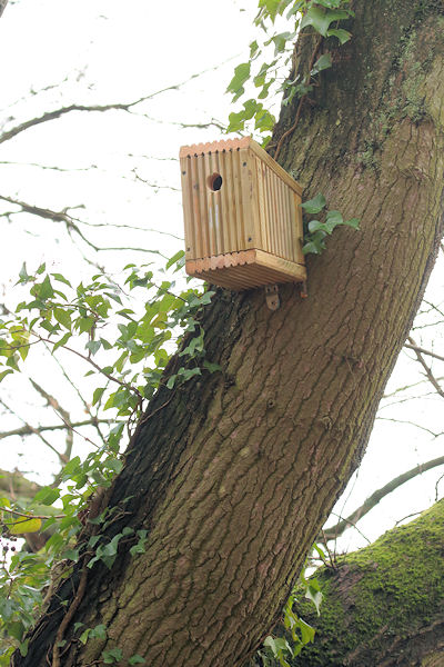 Some boxes will be secreted in the undergrowth and targeted at robins and wrens. As these species prefer their nest boxes lower down and with an open front, they are more vulnerable to predators. As such they need to be protected amongst thick cover and will not be visible from the path. However, the targeted species are noted singers and we hope to be able to install a wooden stump for the sponsor to sit in the vicinity of the box and enjoy the songs of the proud fathers as they proclaim their presence on the territory.